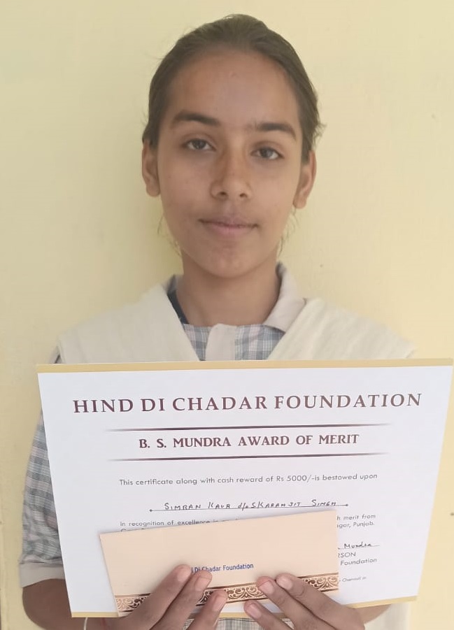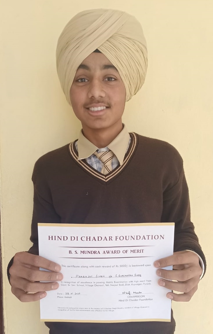 The trustees of Hind Di Chadar Foundation in its meeting held on 6.9.2021, unanimously resolved that in recognition of life time achievements of Late S. Bachan Singh Mundra and his affection for his village Chanauli, the HIND DI CHADAR FOUNDATION shall initiate an award for the student passing Matric Examination with high merit from the Govt. Senior Secondary School, Chanauli. This award shall carry a cash reward of Rs. 5000/- (Rs. Five Thousand only) along with a certificate. This award shall be given every year to one girl student and one boy student. The award shall be named as “B.S. MUNDRA AWARD OF MERIT”.
